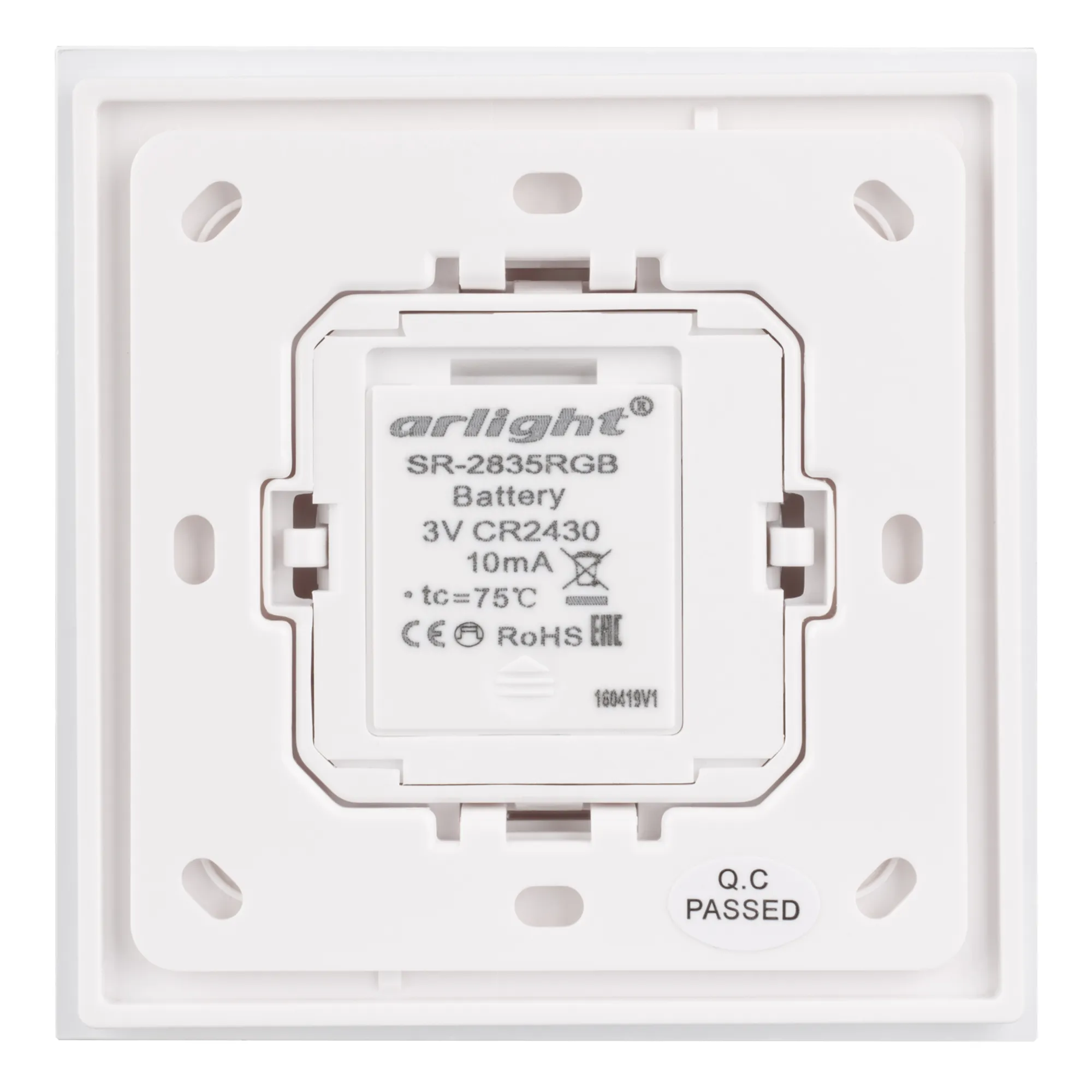 Накладная поворотная панель на стену для с/д RGB лент. Работает вместе с контроллерами серии SR-1009x. Управление по радиоканалу. Питание - 3V батарея CR2430. Размеры 86x86x27 mm. Подходят рамки GIRA Standard55, E2, Event, Esprit.