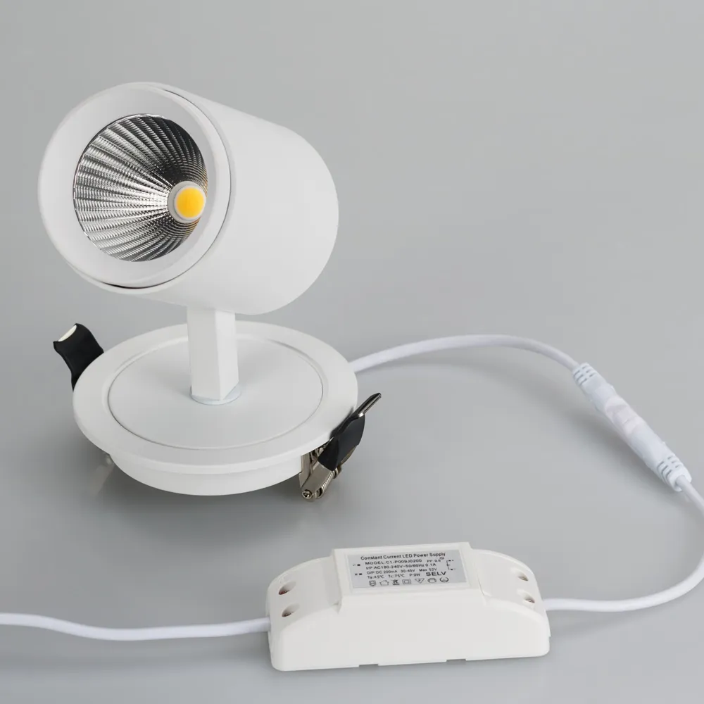 Встраиваемый поворотный светильник для потолка. Светодиод 9W, цвет ТЕПЛЫЙ БЕЛЫЙ 3000K, св.поток 600лм, угол 25°, RA>80. Корпус белый. Мощность 9Вт, питание AC180-240V. Размеры ØDxLxH 62x91x95мм. Установка в отверстие 80мм. Драйвер в комплекте (30-45V 200mA).