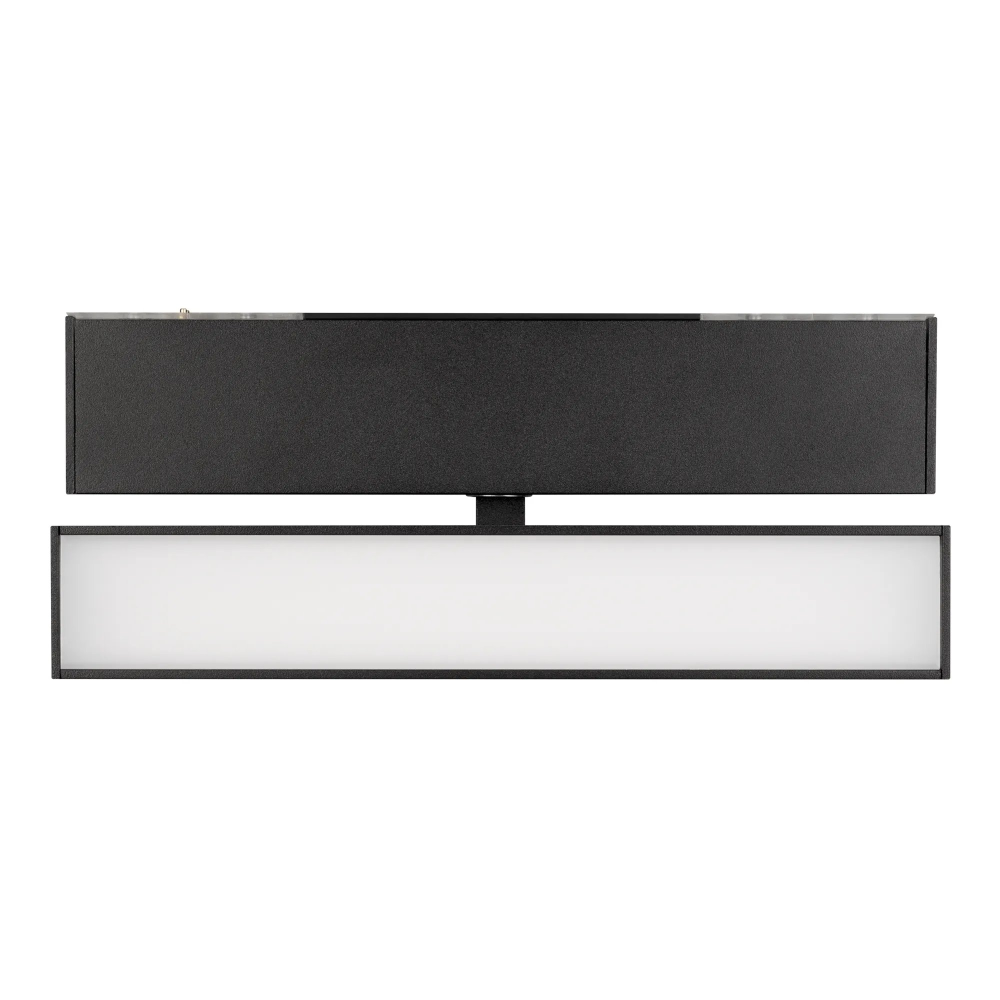 Светильник поворотный для магнитных треков шириной 45мм, 6Вт. Цвет свечения ТЕПЛЫЙ 3000K, световой поток 600лм, угол 100°, CRI>90. Корпус прямоугольный, металл, цвет черный, IP20. Размеры LxWxH 204x35x92.5мм. Входное напряжение DC24V, мощность 6Вт. Драйвер DС24V/AC230V поставляется отдельно. Диммируется только с 026407(1), 027633.