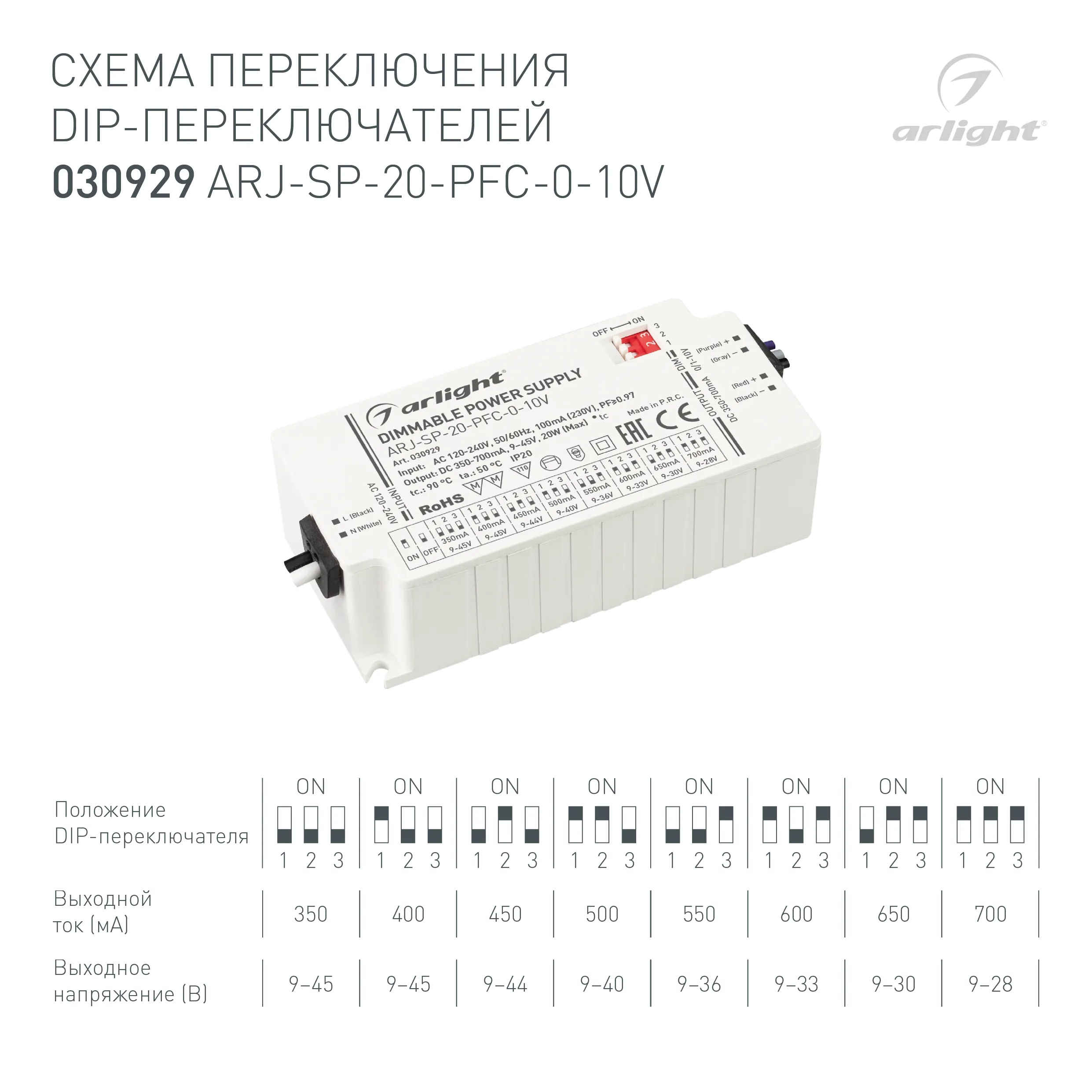 Блок питания ARJ-SP-20-PFC-0-10V (20W, 350-700mA) (Arlight, IP20 Пластик, 5 лет)