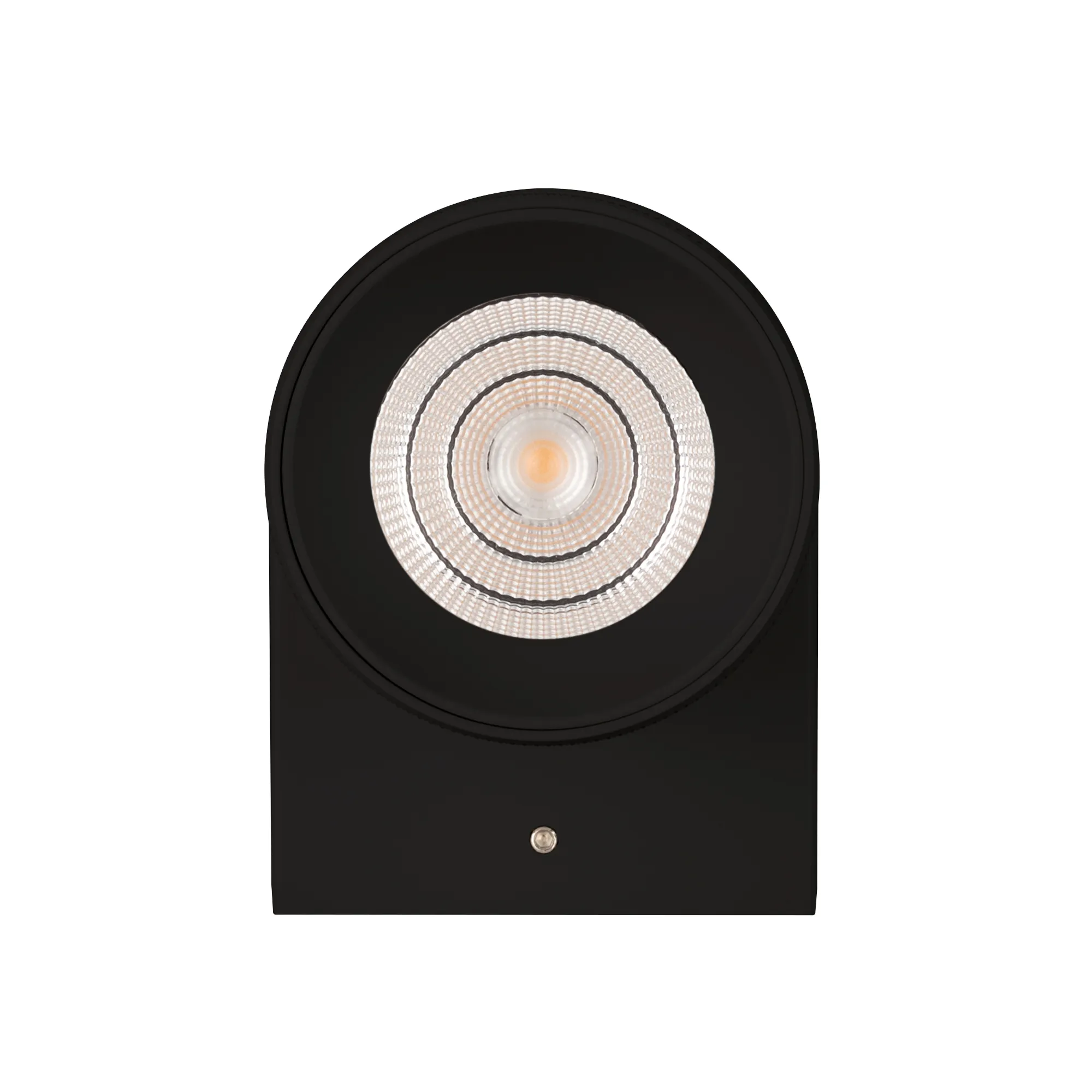 Настенный светильник со свечением вверх или вниз. Мощность 6 Вт, св. поток 360 лм, 55 лм/Вт, теплый 3000 K, CRI>90, угол 40°, напряжение питания 230 В. Черный фигурный корпус из алюминия, степень защиты IP20. Размер: длина 110 мм, ширина 72 мм, высота 115 мм. Монтаж накладной. Драйвер 26-40 В, 150 мА, пульсация <1%.
