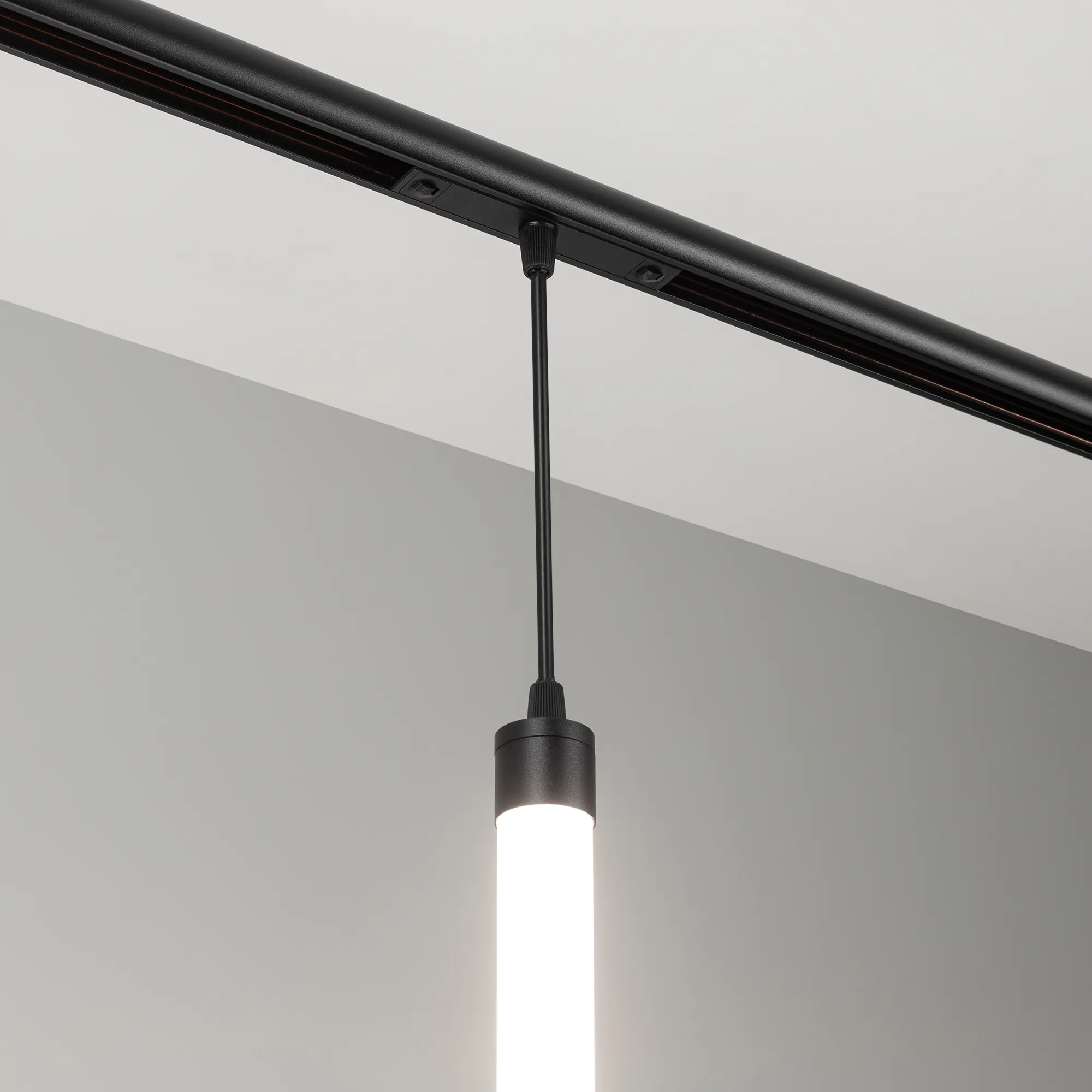 Светильник подвесной для магнитных треков серии FLEX. Мощность 7 Вт, св. поток 450 лм, 67 лм/Вт, дневной 4000 K, CRI>90, угол 360°, напряжение питания 48 В. Матовый белый фигурный корпус из ПВХ. Размер: диаметр 30 мм, длина 530 мм. Длина подвеса 195мм. Монтаж на магнитный трек FLEX.