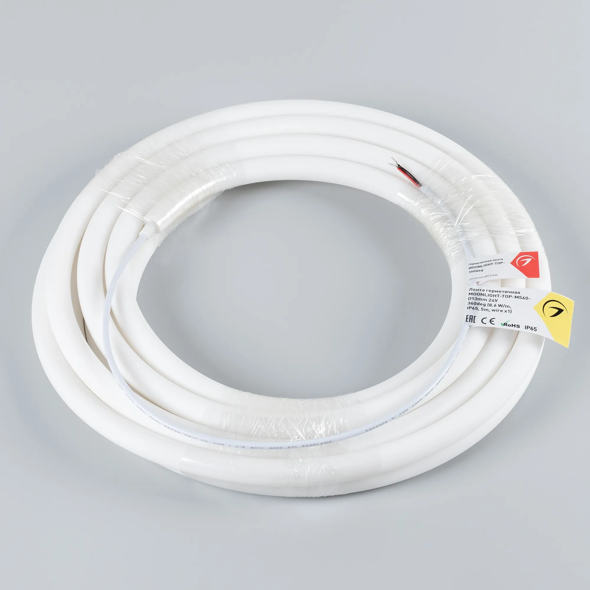 Гибкая герметичная лента (неон серии MOONLIGHT), сечение 13×13 мм. Светодиоды SMD2216 560 шт/м. Цвет свечения ТЁПЛЫЙ (3000 К), индекс цветопередачи CRI>90, световой поток 600 лм/м, угол излучения 360°. Мощность 8.6 Вт/м, питание 24 В. Класс пылевлагозащиты IP65. Размеры 5000×13×13 мм. Изгиб согласно метки на корпусе, минимальный радиус изгиба 60 мм. Кабель питания длиной 500 мм, вывод с одной стороны вдоль линии сечения неона. Катушка 5 м. Цена за 1 м. Гарантия 3 года.