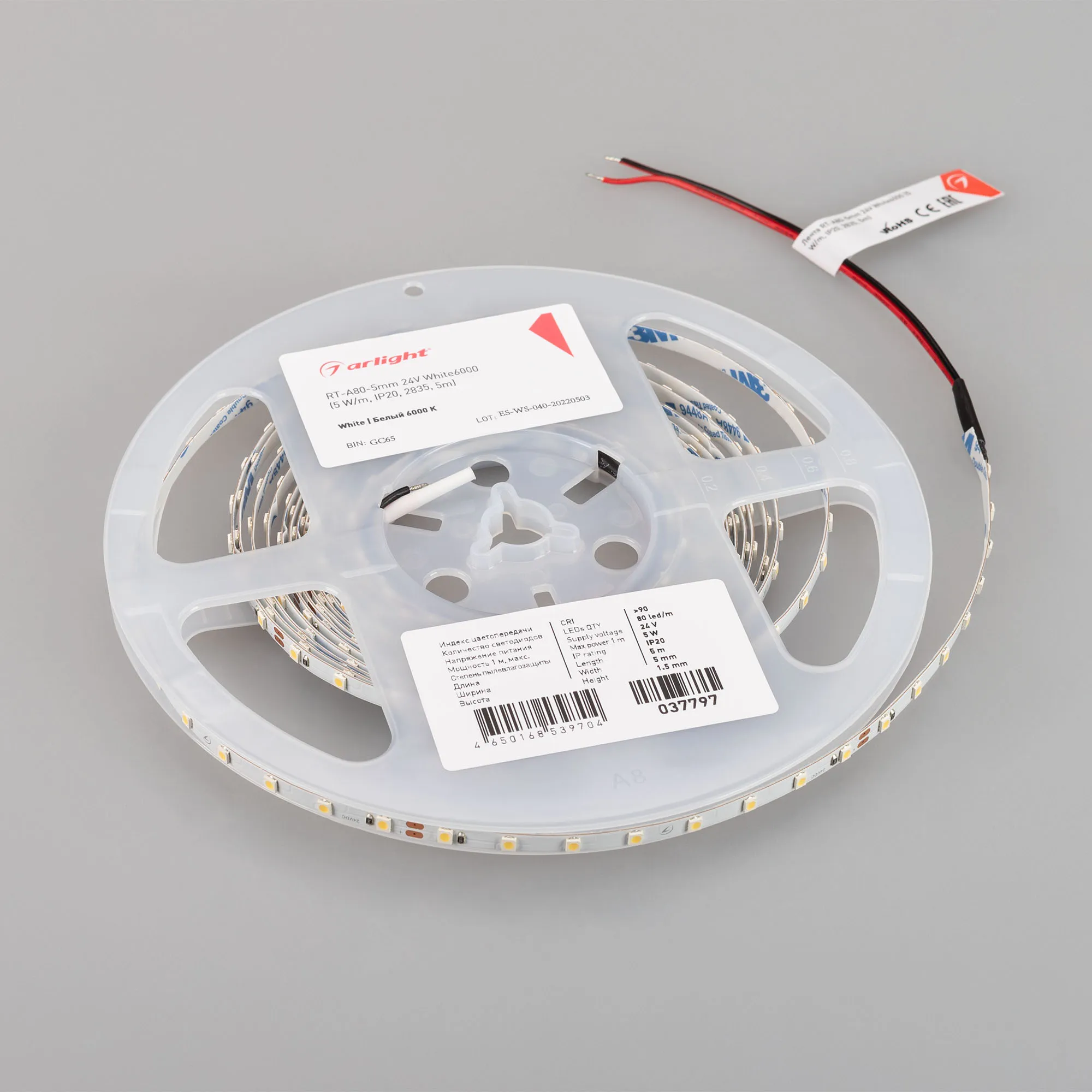 Лента светодиодная RT-A80-5mm 24V White6000 (5 W/m, IP20, 2835, 5m) (Arlight, Открытый)