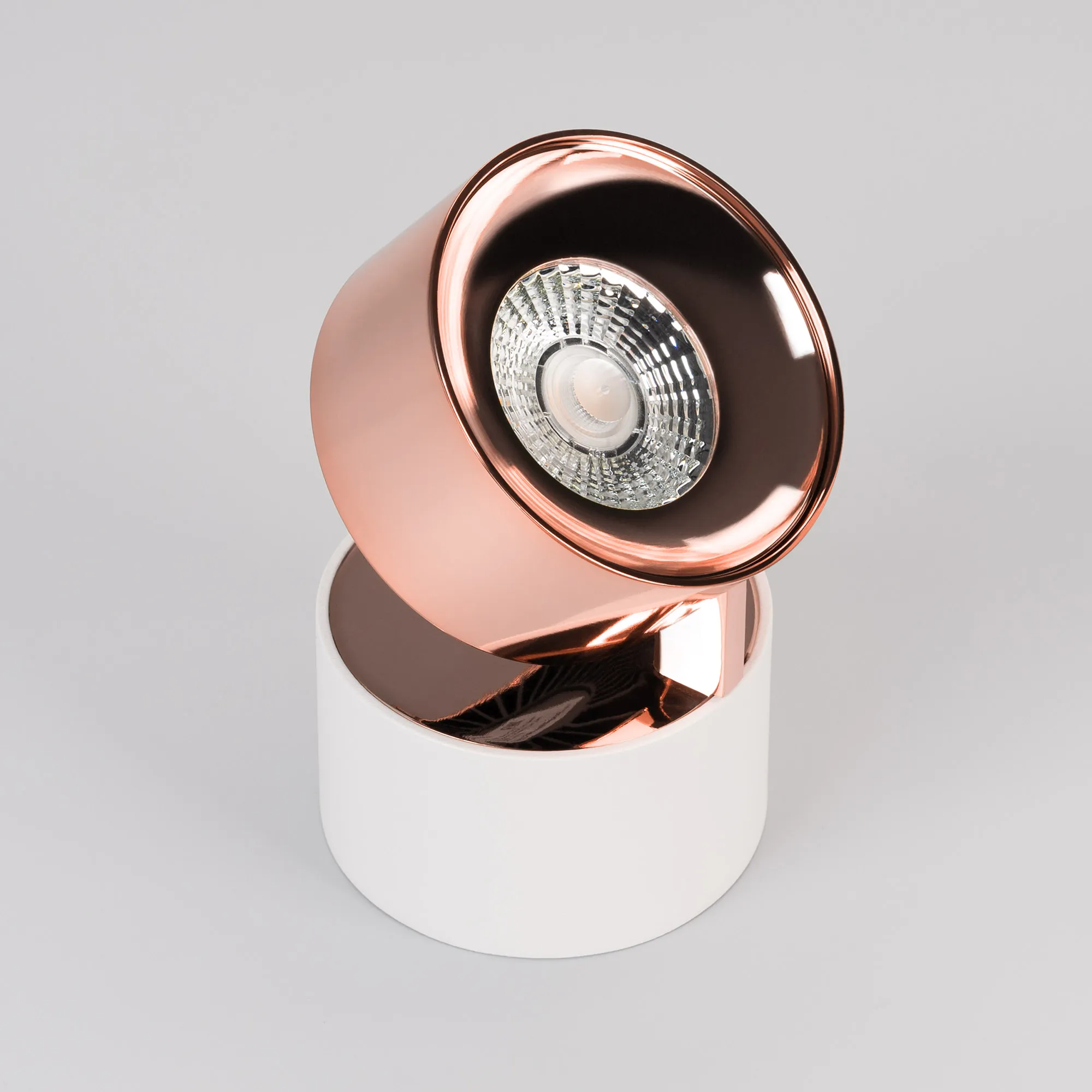Светильник накладной поворотный. Мощность 9 Вт, св. поток 600 лм, 67 лм/Вт, дневной 4000 K, CRI>90, угол 36°, напряжение питания 230 В. Модуль Цвета Медь, Белый круглый корпус из алюминия, экран поликарбонат, степень защиты IP20. Размер: диаметр 77 мм, высота 92 мм. Монтаж накладной. Драйвер 38 В, 200 мА, пульсация <1%.