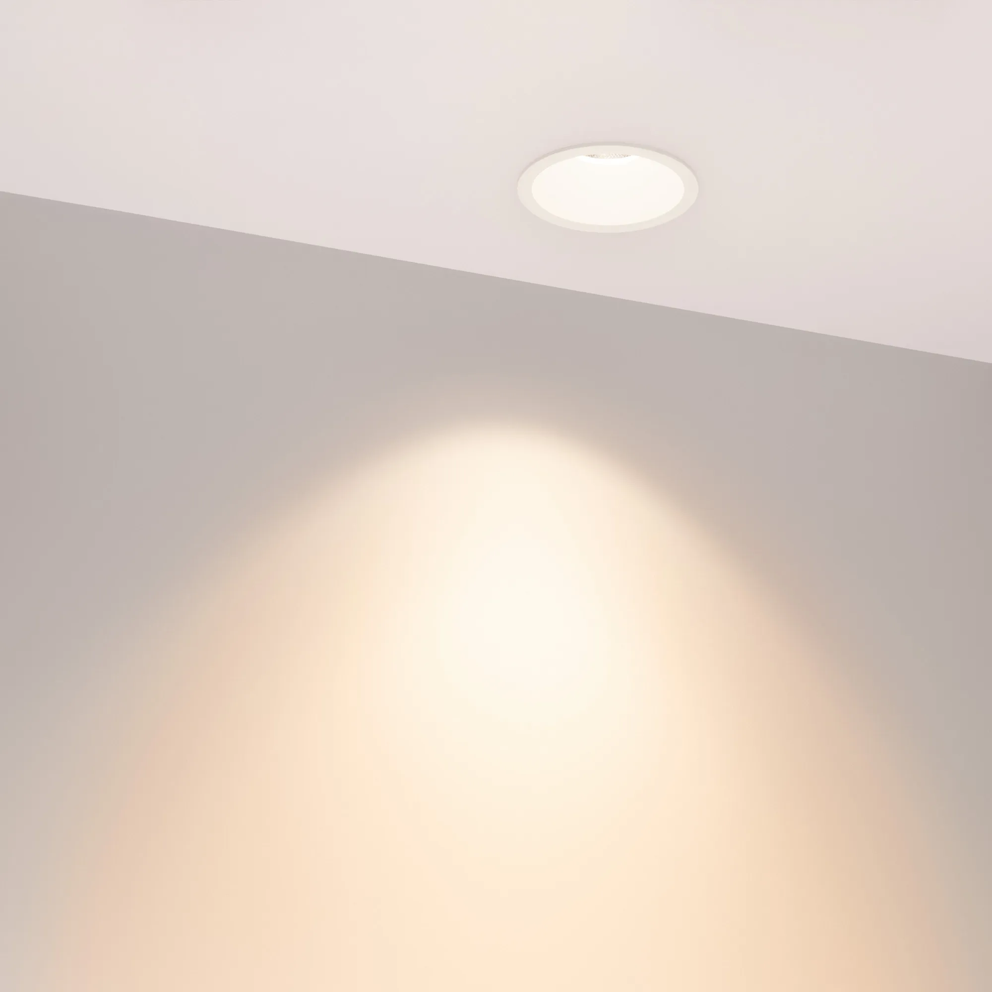 Встраиваемый светильник даунлайт. Мощность 10 Вт, св. поток 980 лм, 98 лм/Вт, тёплый 2700 K, CRI>90, угол 24°, напряжение питания 230 В. Белый круглый корпус из алюминия, степень защиты IP20. Размер: диаметр 82 мм, высота 53 мм. Монтаж встраиваемый, установочное отверстие: диаметр 75 мм. UGR<14. Драйвер 30-42 В, 250 мА, пульсация <2%.