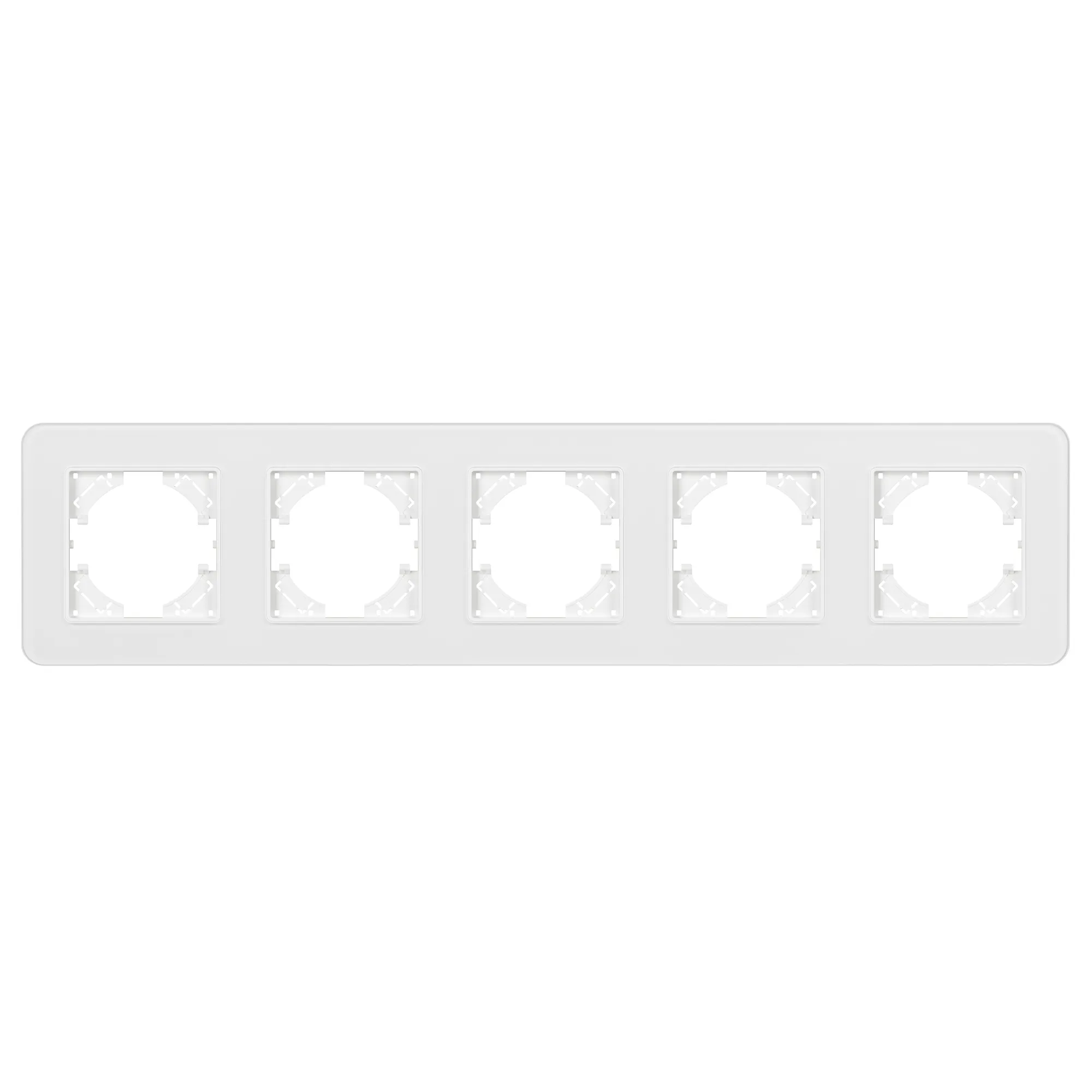 Рамка стеклянная на 5 постов, под встраиваемый механизм. Цвет - белый. Среднего уровня герметичности IP20. Ориентация монтажа - горизонтальная (основным ориентиром служат посадочные выступы для накладки механизма).