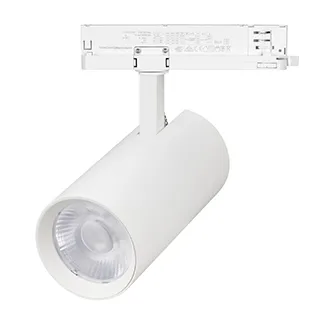 Светильник для треков/шин 4 провода с управлением TRIAC. Мощность 40Вт, св. поток без решетки honeycomb 4000 лм, 100 лм/Вт, с решеткой honeycomb 2640 лм, 66 лм/Вт, теплый 3000 K, CRI>90, угол 55°, напряжение питания 230 В. Белый круглый корпус из алюминия, материал линзы PMMA, степень защиты IP20. Размер: диаметр 90 мм, длина световой части 141 мм. Монтаж на трек 3-фазный. Драйвер встроенный 24-42 В, 750мА., пульсация <5%