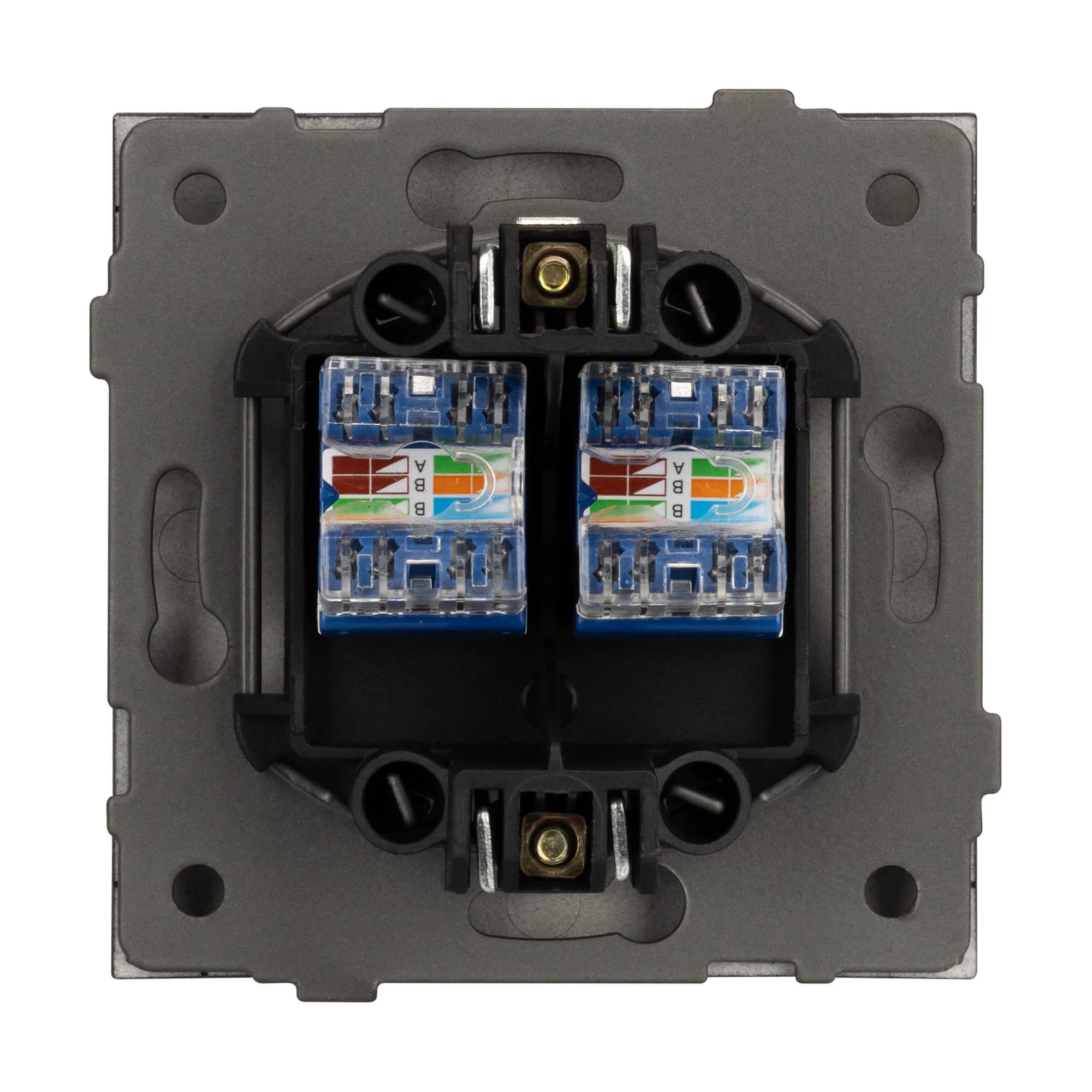 Механизм компьютерной розетки на 2 поста 6-й категории. Цвет - черный. Без фронтальной рамки. Уровень пылевлагозащиты IP20. Розетка устанавливается в стандартный подрозетник круглого сечения диаметром 60мм.